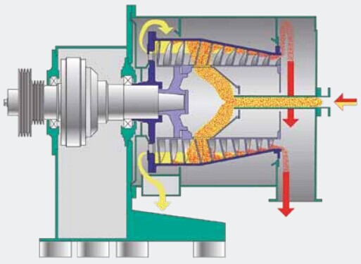 The short drum sedimentation centrifuge is similar to the sedimentation centrifuge with sieve Deli standard. As long as the settling speed of solids in the mother liquor is high enough, the short drum settling centrifuge can be used to separate very fine solids. Although the settling section of the centrifuge is shorter than that of the standard settling centrifuge, the clarification of the liquid is sufficient to be completed in this area. The development of short drum sedimentation centrifuge is mainly aimed at some materials with large density difference between solid and liquid, even very small solids, which can be separated by short drum sedimentation centrifuge as long as the sedimentation speed is high enough. The rotating part of the short drum sedimentation centrifuge adopts the single bearing cantilever design. The proportion of the sedimentation section and the drying section (cone section) is determined by the material characteristics, which is realized by adjusting the overflow weir plate. The design of this equipment is especially suitable for the food industry that needs thorough cleaning (CIP applicable), operation at high temperature or air tightness process.